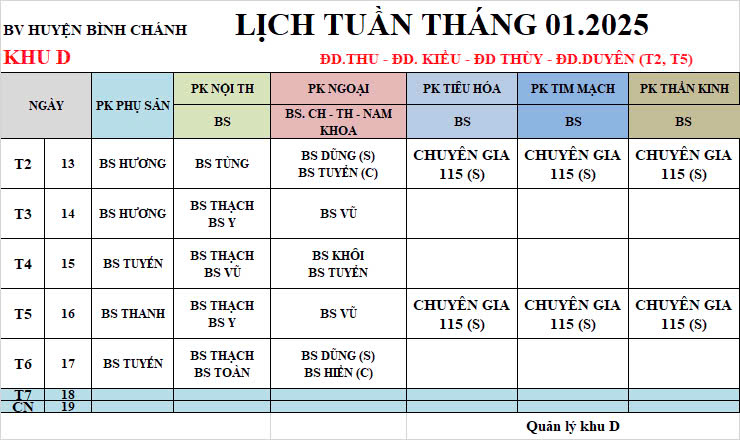 Lịch công tác bác sĩ khu khám kỹ thuât cao 13/01/2025 - 17/01/2025