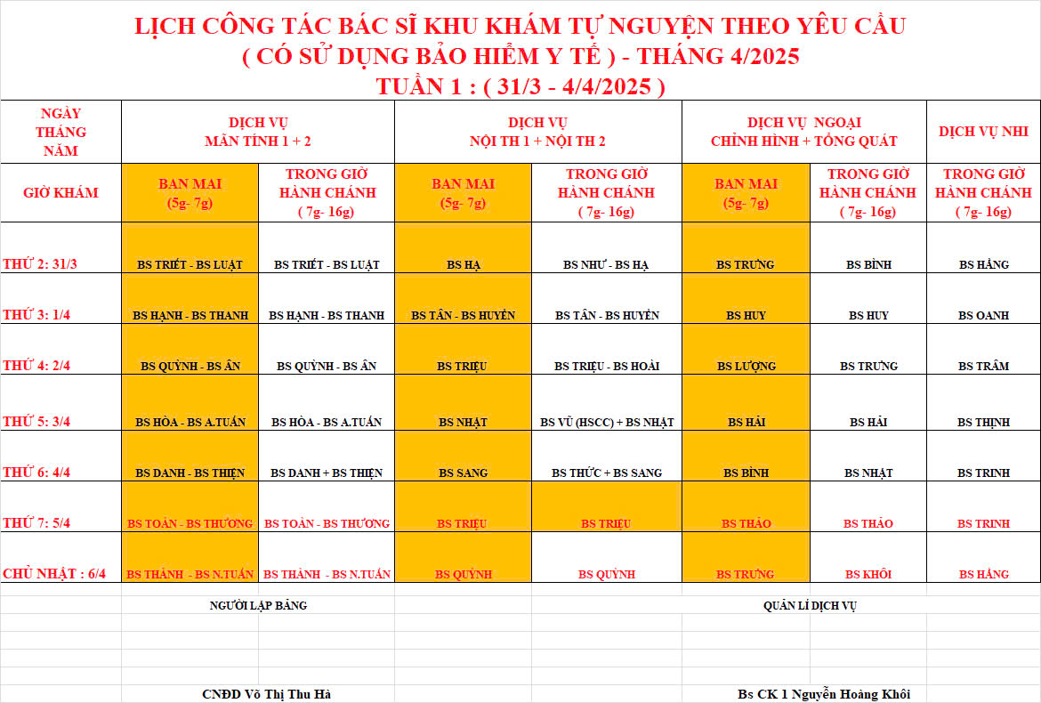 Lịch công tác bác sĩ khu khám TN TYC 31/03/2025 - 06/04/2025