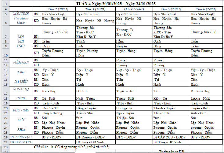 Lịch công tác bác sĩ phòng khám ngoại trú 20/01/2025 - 24/01/2025