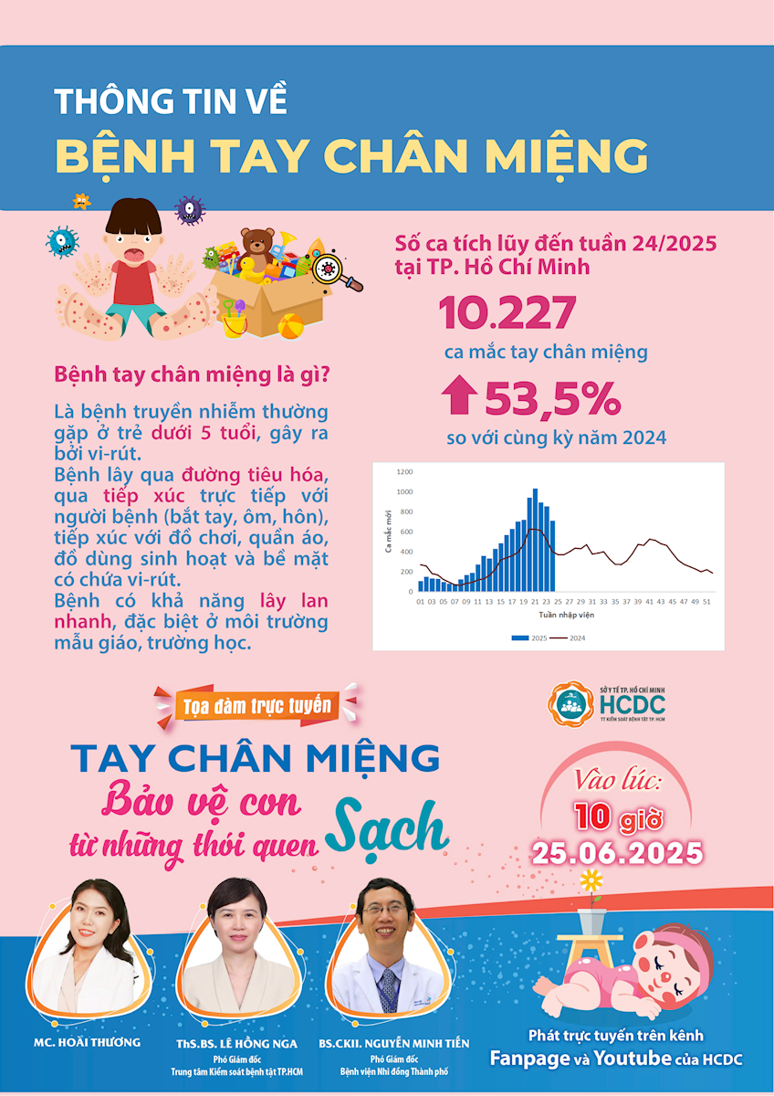 Việc chủ động phòng ngừa bệnh tay chân miệng là vô cùng cần thiết, Trung tâm Kiểm soát bệnh tật Thành phố (HCDC) mời quý phụ huynh và cộng đồng cùng đón xem "Tọa đàm trực tuyến: Tay chân miệng - Bảo vệ con từ những thói quen sạch" phát sóng vào lúc 10 giờ, ngày 25/06/2025 trên kênh Fanpage và Youtube của HCDC. Bấm đăng ký tham gia sự kiện trực tuyến để được nhắc hẹn khi tọa đàm diễn ra qua đường link: https://www.facebook.com/share/19Pp1TZjcs/