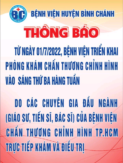 Từ 01/ 7/ 2022, Bệnh viện huyện Bình Chánh triển khai phòng khám chuyên gia Chấn thương chỉnh hình, do các chuyên gia đầu ngành (Giáo sư, Tiến sĩ, Bác sĩ...) của Bệnh viện CHẤN THƯƠNG CHỈNH HÌNH TP.HCM trực tiếp khám và điều trị.